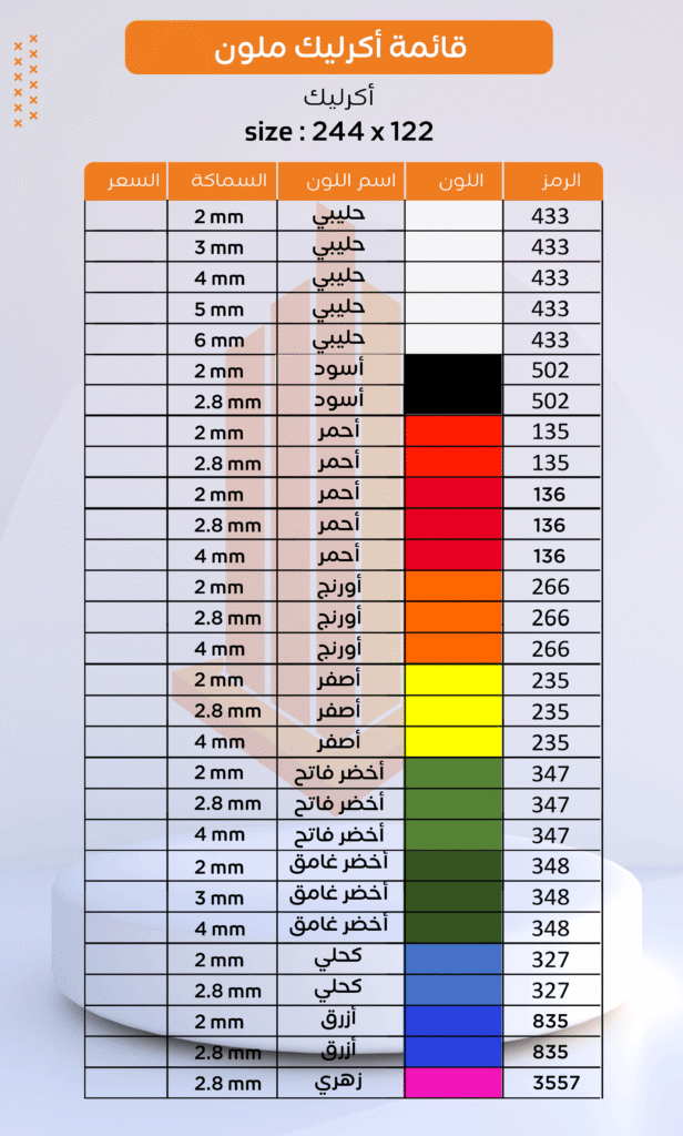 قائمة ألواح الأكريليك شفاف المتوفرة لدينا